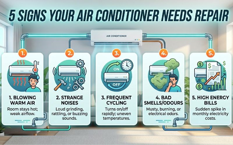This guide covers the top 5 signs your air conditioner needs repair—so you can make a move before it’s too late.